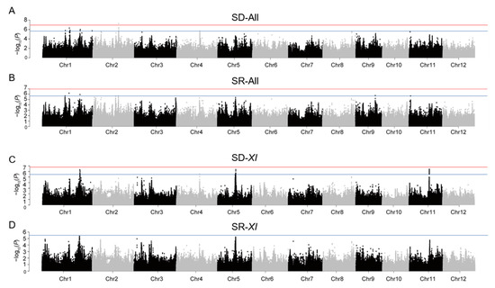 Figure 2. Genome-wide association study of SD and SR. (A) Manhattan plot of GWAS results for SD in the whole population. (B) Manhattan plot of GWAS results for SR in the whole population. (C) Manhattan plot of GWAS results for SD in the XI population. (D) Manhattan plot of GWAS results for SR in the XI population. The suggestive significance threshold (p = 2.29 × 10−6) is indicated by the horizontal blue lines.