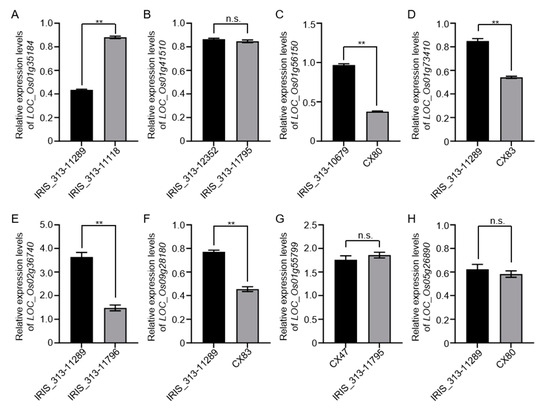 Figure 3. The expression levels of candidate genes relative to those under 4 °C for 2 h. (A) Relative expression levels of LOC_Os01g35184: IRIS_313-11289 contained a favorable haplotype and IRIS_313-11118 contained an inferior haplotype. (B) Relative expression levels of LOC_Os01g41510: IRIS_313-12352 contained a favorable haplotype and IRIS_313-11795 contained an inferior haplotype. (C) Relative expression levels of LOC_Os01g56150: IRIS_313-10679 contained a favorable haplotype and CX80 contained an inferior haplotype. (D) Relative expression levels of LOC_Os01g73410: IRIS_313-11289 contained a favorable haplotype and CX83 contained an inferior haplotype. (E) Relative expression levels of LOC_Os02g36740: IRIS_313-11289 contained a favorable haplotype and IRIS_313-11796 contained an inferior haplotype. (F) Relative expression levels of LOC_Os09g28180: IRIS_313-11289 contained a favorable haplotype and CX83 contained an inferior haplotype. (G) Relative expression levels of LOC_Os01g55799: CX47 contained a favorable haplotype and IRIS_313-11795 contained an inferior haplotype. (H) Relative expression levels of LOC_Os05g26890: IRIS_313-11289 contained a favorable haplotype and CX80 contained an inferior haplotype. After normalizing gene expression to the OsActin gene control, the relative expression levels were calculated as fold changes compared to the expression levels of the candidate genes. Statistical significance was indicated by ** p < 0.01 (two-tailed Student’s t-test), and the data are presented as means ± SD (n = 3). The experiment was set up with three biological replicates.