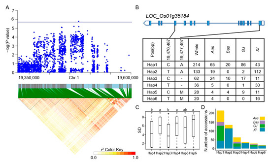 Figure 4. Analyzing candidate genes associated with qSD1-1 located on chromosome 1. (A) Local Manhattan plot (top) and LD heat map (bottom) of qSD1-1 for SD in the whole population. (B) Coding region haplotype analysis of LOC_Os01g35184. (C) SD distribution across the whole population for the six haplotypes of LOC_Os01g35184. Distinct letters above each box plot signify significant differences among haplotypes, as per Duncan’s multiple range post-hoc test (p < 0.05). (D) The number of subpopulations in the six haplotypes of LOC_Os01g35184.