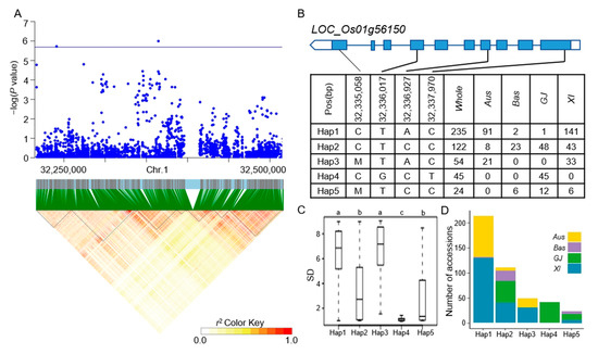 Figure 5. Analyzing candidate genes associated with qSD1-4 located on chromosome 1. (A) Local Manhattan plot (top) and LD heat map (bottom) of qSD1-4 for SD in the whole population. (B) Coding region haplotype analysis of LOC_Os01g56150. (C) SD distribution across the whole population for the five haplotypes of LOC_Os01g56150. Distinct letters above each box plot signify significant differences among haplotypes, as per Duncan’s multiple range post-hoc test (p < 0.05). (D) The number of subpopulations in the five haplotypes of LOC_Os01g56150.
