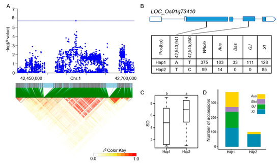 Figure 6. Analyzing candidate genes associated with qSD1-5 located on chromosome 1. (A) Local Manhattan plot. (top) and LD heat map (bottom) of qSD1-5 for SD in the whole population. (B) Coding region haplotype analysis of LOC_Os01g73410. (C) SD distribution across the whole population for the two haplotypes of LOC_Os01g73410. Distinct letters above each box plot signify significant differences among haplotypes, as per Duncan’s multiple range post-hoc test (p < 0.05). (D) The number of subpopulations in the two haplotypes of LOC_Os01g73410.