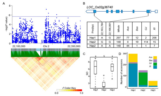Figure 7. Analyzing candidate genes associated with qSD2-1 located on chromosome 2. (A) Local Manhattan plot (top) and LD heat map (bottom) of qSD2-1 for SD in the whole population. (B) Coding region haplotype analysis of LOC_Os02g36740. (C) SD distribution across the whole population for the six haplotypes of LOC_Os02g36740. Distinct letters above each box plot signify significant differences among haplotypes, as per Duncan’s multiple range post-hoc test (p < 0.05). (D) The number of subpopulations in the three haplotypes of LOC_Os02g36740.