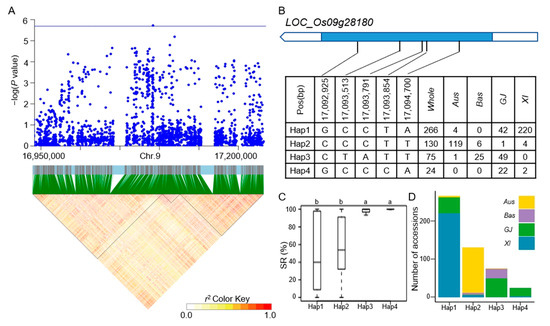 Figure 8. Analyzing candidate genes associated with qSR9-1 located on chromosome 9. (A) Local Manhattan plot (top) and LD heat map (bottom) of qSR9-1 for SD in the whole population. (B) Coding region haplotype analysis of LOC_Os09g28180. (C) SD distribution across the whole population for the four haplotypes of LOC_Os09g28180. Distinct letters above each box plot signify significant differences among haplotypes, as per Duncan’s multiple range post-hoc test (p < 0.05). (D) The number of subpopulations in the four haplotypes of LOC_Os09g28180.