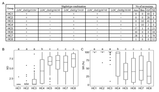 According to the results of the haplotype analysis of five candidate genes, Hap1 and Hap3 of LOC_Os01g35184, Hap4 of LOC_Os01g56150, Hap1 of LOC_Os01g73410, Hap2 of LOC_Os02g36740, and Hap3 and Hap4 of LOC_Os09g28180 were identified as the favorable haplotypes of CT, and other haplotypes were relatively defined as inferior haplotypes. To investigate the potential of candidate genes in rice cold tolerance breeding, the cumulative effects of combined haplotype analysis were examined within the population. After eliminating rare haplotype combinations, eight groups remained (n < 10 accessions). The groups HC1 to HC8 contained 5, 4, 4, 3, 2, 1, 1, and 0 favorable haplotypes, respectively. The groups HC1, HC2, and HC3 were enriched in the GJ subpopulation. The groups HC5, HC6, and HC7 were mainly distributed in the Aus and XI subpopulations. The group HC8 was mainly found in the XI subpopulation. Comparing the SD and SR of different haplotype combinations, it was found that the groups with more favorable haplotype genes would have lower SD and higher SR (Figure 9, Table S14). The results showed that pyramiding of different favorable haplotypes of CT genes may be an effective way to improve the CT of rice at the bud burst stage.