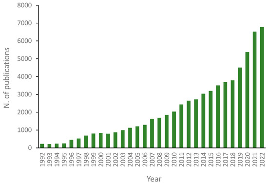 If we observe the trend of the past few decades, we notice an increase in scientific publications (articles, reviews, etc.) in the field of pest and disease management. A search for articles indexed in the database Scopus using the keywords (pest) OR (plant AND disease) AND (management) produced nearly 66,000 publications in the last 30-year period (1992–2022) with a 12% compound annual growth rate (Figure 1). This trend is reflected by the journal Agronomy (ISSN: 2073-4395), for which a search using the abovementioned keywords on the same database produces around 350 documents showing a compound annual growth rate over the last 10 years period (2012–2022) of 17%, aligning with the fast growth of this young scientific journal in terms of the number of published articles. Please note that this keyword-based search is only representative of a general trend and is not inclusive of all articles that are actually published in the dedicated section. According to the keyword-based search in the database Scopus, articles published in Agronomy represent nearly 1.7% of the total articles in the field of pest and disease management published by the scientific community in the previous year (2022), which supports the need for this journal’s dedicated section.