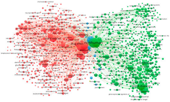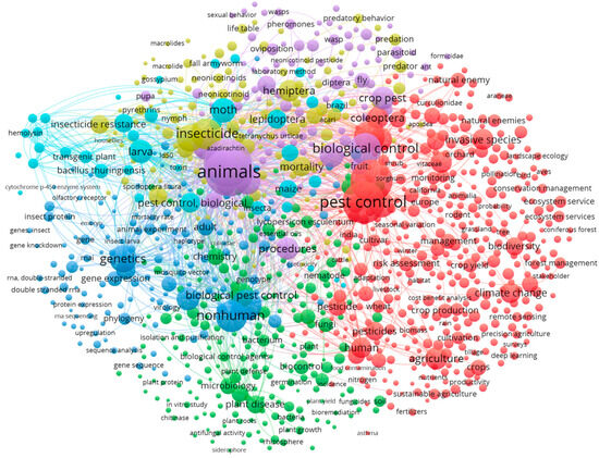 In order to gain a more in-depth picture of the present trend and future outlook in scientific research within the aforementioned three categories of pest, plant disease and weed management, bibliographic data obtained from the Scopus database and referring to the last 5 years (2017–2022), were exported as RIS files (including document titles, keywords and abstracts) and analysed using software VOSviewer version 1.6.20 [10] to visualise the co-keyword network for individual categories. On this basis, nearly 20,000 documents were listed for “Pest management”, grouped into six main clusters, including major topics such as pest control, biological control, insecticide, crop pest biology and ecology, invasive species, agriculture, climate change, biodiversity, natural enemies, insecticide resistance, genetics (to mention just a few), which summarises the breadth and diversity of original scientific research subjects within this category (Figure 2). Similarly, nearly 15,000 bibliographic documents were identified for “Plant disease management”, highlighting the most frequent keywords and distinguishing two strands of research concerning the use of plant extracts for human health (off-topic from the scope of this editorial) and the defence of plants against disease agents. This latter includes articles on bacterial, fungal, and viral pathogens, their genetic, biochemical, and microbiological features, pathogenicity and endophytic mechanisms, plant physiology, growth, health, water management, and climate change implications (Figure 3). Finally, the category “Weed management” appears to be represented by a comparatively lower but still significant number of publications (nearly 7000) covering a wide variety of topics, including studies on herbicides and weed control, herbicide resistance, chemistry and allelopathy, biodiversity and invasive species, agricultural crop protection and farming systems, water management, and biodegradation (Figure 4).