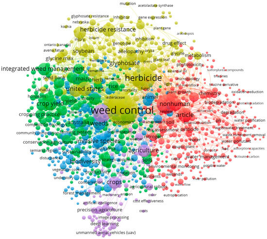 Networks of the most frequent terms in the scientific literature from the period 2017 to 2022 based on a keyword search in Scopus database for weed management.
