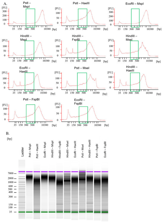 The products of enzymatic digestion with the above combinations of restriction enzymes were analyzed using an Agilent 2100 Bioanalyzer with a High Sensitivity DNA kit. Within the 300–600 bp range, the concentration, molarity, and percentage of the resulting fragment pool were calculated for each sample.