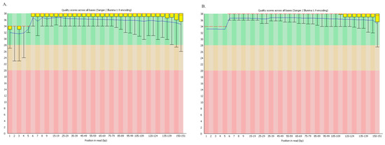 Based on the results of the efficiency analysis of the RE pairs and the literature data, PstI—MspI and HindIII—FspBI for barley and maize, respectively, were selected for further testing. To verify that the selected restriction systems were effective regardless of the genotype tested, the number of DNA samples was increased to 17 for wheat and 24 for barley. From the resulting fragment mixtures after restriction digestion, a total of 41 ddRAD-Seq libraries were prepared and subjected to NGS sequencing. After sequencing, a total of 17,648,717 raw reads were obtained for maize and 23,876,096 for barley. The Phred score for all reads from the ddRAD-Seq libraries was above 30 for the entire length of the fragments (Figure 4). Bioinformatic analysis and SNP calling revealed that approximately 50,500 fragments with allele frequencies ≥0.05 and at least 5× [28] coverage were obtained for barley. For maize, 10,500 such fragments were obtained.