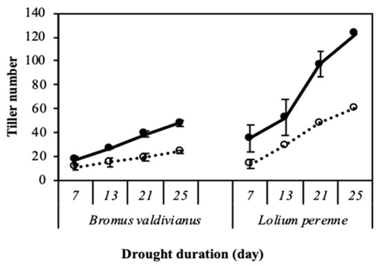Tiller numbers of Bromus valdivianus and Lolium perenne exposed to water treatments at 80~85% FC (●) and 20~25% FC (○) (means ± sem; n = 5).