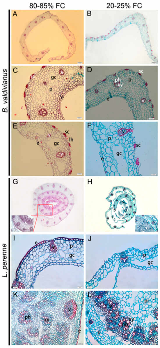 Anatomical pseudostem structure of Bromus valdivianus (Bv) and Lolium perenne (Lp) and stem structure of Lp exposed to two soil water restrictions. (A–F), Bv; (G–L), Lp (n = 15 per plant organ). Column 1 shows under 80~85% FC; column 2 illustrates under 20~25% FC. Rows 1~3 represent cross-sections of pseudostems of Bv; row 2 depicts a young pseudostem; row 3 illustrates a senescent pseudostem; Rows 4~5 represent Lp cross-sections of young and senescent pseudostems, respectively; row 6 depicts a stem of Lp. The images (A,B,G,H) were taken at 10 × 4; the other images were taken at 10 × 20. Scale bar = 100 μm in (A,B); 40 μm in (C–E); and 20 μm in (F,I–L). Letters within the images indicate: e, epidermis; gc, gas cavity; lh, leaf hair; p, parenchyma; ph, phloem; pi, pith; sc, sclerenchyma; v, vascular bundle; and xy, xylem.