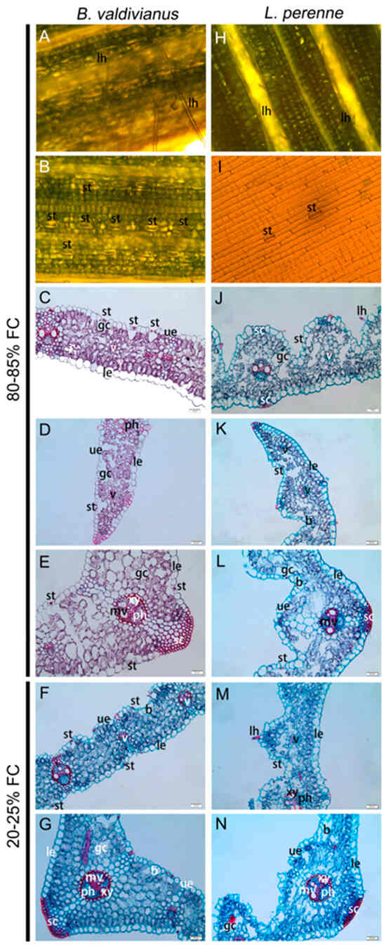 Blade anatomical structures of B. valdivianus (Bv) and L. perenne (Lp) exposed to 80~85% FC (A–E,H–L) and to 20~25% FC (F,G,M,N). Left column, Bv; right column, Lp. Row 1 represents a blade surface showing leaf hair. Row 2 depicts stomata in the lower surface of a blade. Rows 3 and 6 represent the cross-section of a blade. Row 4 depicts the edge of a blade. Rows 5 and Row 7 illustrate the mid-vein of a blade (n = 15 per plant organ). The images in (A,B,H,I) were taken at 6.8 times under a stereoscope; the other images were taken at 10 × 20. Scale bar = 20 μm in (C–G,J–H). Letters within the images indicate: b, bulliform; le, lower epidermis; gc, gas cavity; lh, leaf hair; mv, mid-vein; ph, phloem; sc, sclerenchyma; st stoma; ue, upper epidermis; v, vein; and xy, xylem.