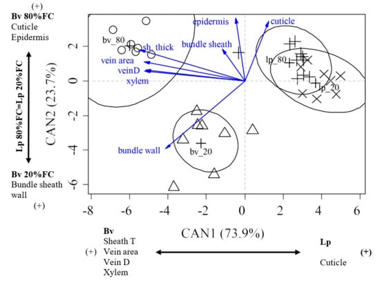 The interaction between species and water restriction was analysed via CVA, which explained 97.6% of the total differences between the treatments measured with the variables of the pseudostem structures. Wilk’s Lambda was extremely significant (p ≤ 0.0001; Figure 4). CAN 1 explained 73.9% of the differences between the treatments, which were mainly based on species differences due to morphological attributes in that Bv had a higher sheath thickness, vein area, vein diameter, and xylem values, while Lp was strongly correlated to the increase in cuticle thickness.