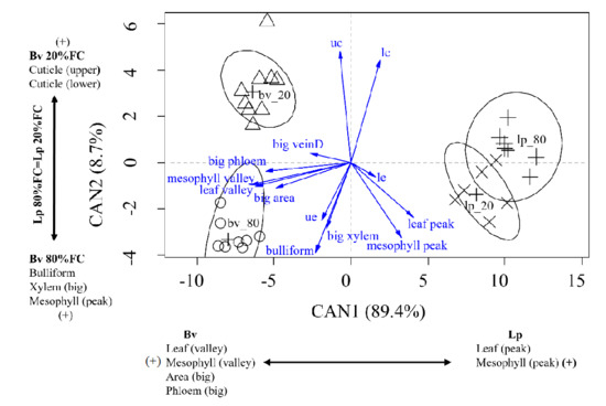 Leaf blade anatomical trait differences between the species were shown via CAN 1 in that Bv had a larger leaf thickness (valley), mesophyll thickness (valley), wider mid-vein, and bigger phloem, while Lp had a larger leaf thickness (peak) and mesophyll thickness (peak). CAN 2 showed a contrast between the increase in the bulliform size, xylem width, and thicker mesophyll (peak), which had a strong positive relationship with Bv 80–85% FC. However, an increase in the upper and lower cuticle thickness levels of Bv was associated with increased water restriction, suggesting that the response of Bv to the water restriction was through the reduction in the bulliform size, xylem width, and mesophyll thickness (peak) (Figure 5). In addition, Lp did not exhibit significant alterations to blade structures with increasing water restriction.