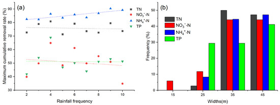 Under high-frequency rainfall simulation, the maximum cumulative removal rate of TN in runoff ranged from 71.3% to 80.9% (average 75.8%) (Figure 2). The peak of TN removal rate mainly occurred at widths of 35 m and 45 m, with frequencies of 50% and 47%, respectively. The removal rate of NO3−-N was 34.8%~64.9% (average 50.5%), and the peak of NO3−-N removal rate similarly appeared at widths of 35 m and 45 m, with the frequency being 44% and 44%, respectively (Figure 2). Additionally, the peak removal rate for NO3−-N also occurred at GBS widths of 15 m and 25 m, with frequencies of 6% and 12% (Figure 2). For NH4+-N, the maximum removal rate was 82.3~90.4% (average 85.7%), and the peak of NH4+-N removal rate mainly occurred at widths of 25 m and 45 m, with frequencies of 44% and 47%, respectively. In addition, the maximum removal rate of TP was 41.8~68.9% (average 51.2%), and the peak frequency of TP removal rate appeared at 25 m, 35 m, and 45 m GBS width, which were 29%, 29%, and 47%, respectively (Figure 2).