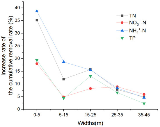The increase in the cumulative removal rate for nitrogen and phosphorus at different GBS widths is shown in Figure 3. The maximum increase rate of cumulative removal rates for TN, NH4+-N, NO3−-N, and TP occurred at 0–5 m buffer widths, with values of 35.2%, 18.0%, 38.7%, and 19.4%, respectively. The minimum increase rate of cumulative removal rates occurred at a buffer width of 35–45 m. For TN, the cumulative removal rate increased by more than 10% from 0 to 5 m, 5 to 15 m, and 15 to 25 m widths, but only by 7.8% and 4.9% of growth rate from 25 to 35 m and 35 to 45 m widths. The overall trends for NH4+-N and NO3−-N removal were similar to those of TN. For TP, there were two higher increase rates of the cumulative removal rate at the 0–5 m and 15–25 m widths (19.4% and 13.1%, respectively), while the growth rates at the 5–15 m, 15–25 m, and 25–35 m widths were only 2.3% to 6.6%. Overall, the increase in the removal rates for nitrogen and phosphorus from 0 to 25 m width was higher than that from 25 m to 45 m.