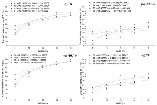 The width of the GBS obviously affects its ability to remove runoff pollutants. Shirley and Smith [35] indicated that pollutants in runoff could be effectively removed when the buffer width was between 4.8 m and 49.2 m, while a wider buffer zone only increased the storage space of various nutrients and did not have a significant effect on the absorption and conversion efficiency of nutrients. Gharabaghi et al. [36] found that the reduction efficiency of the buffer zone on suspended matter increased from 50% to 98% when the buffer width increased from 2.5 m to 19.5 m. Additionally, some studies have confirmed that the optimal width is between 10 and 15 m, which could remove 70~90% of the nutrient contaminants [29]. In this study, regardless of inflow conditions, increasing the GBS width significantly improved the removal rate of runoff pollutants (p < 0.05). Through fitting the buffer zone width and the average cumulative removal rate, it was found to be consistent with a growing trend as a function of the logarithm, with excellent fits. The variation r2 ranges from 0.54203 to 0.99733.