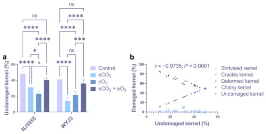 Effects of eCO2, eO3, and their combination on the ratio of undamaged kernels in rice cultivars (a) and the correlation of the ratios between different types of damaged kernels and undamaged kernel mean across the treatments and cultivars (b). * (p < 0.05), *** (p < 0.001), **** (p < 0.0001), and ns (not significant) are the results of multiple comparisons.