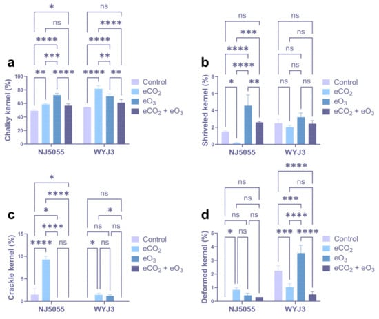 Effects of eCO2, eO3, and their combination on the ratio of chalky (a), shriveled (b), crackle (c), and deformed (d) kernels. * (p < 0.05), ** (p < 0.01), *** (p < 0.001), **** (p < 0.0001), ns (not significant) are the results of multiple comparisons.