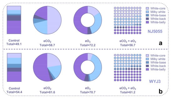 We found that eCO2 and eO3 altered the proportion of different types of chalky kernels, and the alteration was cultivar-dependent. In NJ5055, at control, white-back kernels contributed the most to the chalky kernels; at eCO2 and eCO2 + eO3, white-core kernels contributed the most to chalky kernels, respectively; at eO3, milky white kernels contributed the most to the chalky kernels. In WYJ3, at control, eCO2, and eO3, white-belly kernels contributed the most to the chalky kernels, respectively; at eCO2 + eO3, milky white kernels shared the largest proportion compared to other types. White-back and milky white kernels usually appear once the rice plant is exposed to higher temperatures [,], whose mechanisms include resource portioning among grains. The source ability, e.g., the amount of starch substrates per grain, significantly affects the occurrence of milky white grains [,].