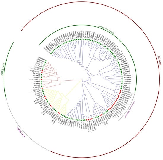 Analysis of phylogenetic relationships in the GRX family in wheat, barley, and Arabidopsis. The genes in wheat, barley, and Arabidopsis are indicated with a green solid triangle, green hollow triangle, and red solid triangle, respectively. The CC, CPYC, and CGFS subfamilies are indicated with a dark red arc, dashed arc (outer circle), and dark green arc (outer circle), respectively. The dashed arc (inner circle) is the branch containing only GRX genes of Arabidopsis, and the dark green arc (inner circle) is the branch containing only GRX genes of barley and wheat.