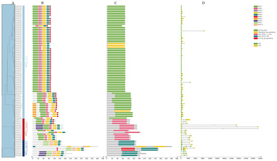 Analysis of motif and gene structure of TaGRX genes. (A) Phylogenetic evolution tree of wheat TaGRX genes, (B) conservative motif composition of TaGRX genes, (C) functional domains of TaGRX genes, (D) and exon/intron structure of TaGRX genes.