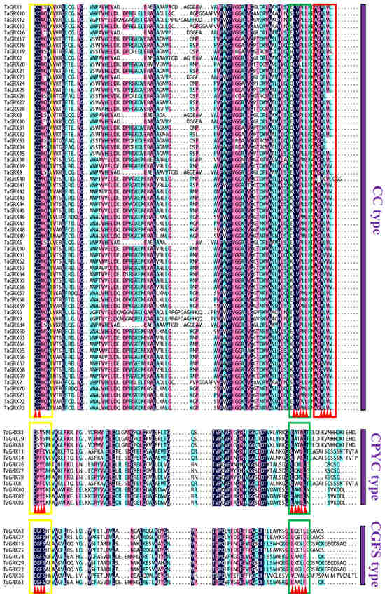 Comparison of the active sites and C-terminal protein sequences of TaGRX proteins. The yellow, green, and red boxes indicate the Cxx[C/S], C-terminal conserved LxxLL motifs, and conserved ALWL terminus of the CC subfamily, respectively. The background color of dark blue represents 100% identity, pink represents 75% identity, blue-green represents 50% identity, as defined by DNAMAN (v9).