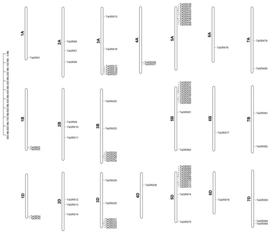 Chromosomal localization of TaGRX genes. The left scale indicates the length and physical location of the chromosome, and the chromosome number is shown on the left side of the image of each chromosome.