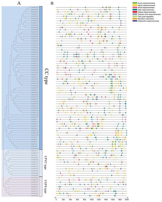 Cis-regulatory element of the promoter of TaGRX genes in wheat. (A) Phylogenetic evolution tree of TaGRX genes in wheat; (B) schematic diagram of the cis-regulatory element of the promoter of TaGRX genes.