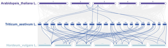 Synteny analysis of GRX genes in Arabidopsis, wheat, and barley. Gray lines indicate homologous gene pairs in the genome of wheat with those of Arabidopsis and barley. Blue lines indicate GRX gene pairs with homology in the genome of wheat with those of Arabidopsis and barley. The chromosome number is shown at the top of each chromosome.