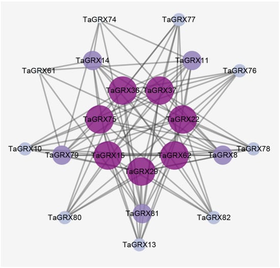 PPI network prediction model for TaGRXs. A larger circle and darker color indicate more interactions with other proteins.