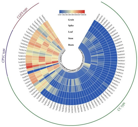 To understand the expression characteristics of GRX genes in various wheat tissues, a heat map was created by downloading expression levels of 85 TaGRX genes in five tissues (roots, stems, leaves, spikes, and seeds) of the wheat variety China Spring from WheatOmics 1.0. Significant differences were observed in the expression patterns of TaGRX genes in various tissues (Figure 9). These differences were mainly reflected in the different subfamilies, as indicated by the fact that all CPYC and CGFS subfamily members had high expression levels in different tissues, whereas only 11% of the CC subfamily members had high expression levels in different tissues. For example, TaGRX14, TaGRX79, TaGRX82, and TaGRX85 of the CPYC subfamily and TaGRX15, TaGRX22, and TaGRX29 of the CGFS subfamily were highly expressed in all tissues, whereas TaGRX18, TaGRX24, TaGRX31, and other genes of the CC subfamily were hardly expressed in all tissues. Interestingly, the expression of most genes of the CC subfamily was tissue-specific; for example, TaGRX26, TaGRX33, and TaGRX34 were only highly expressed in the roots. TaGRX39 and TaGRX50 were more expressed in the stems; TaGRX46, TaGRX58, and TaGRX71 were more expressed in the stems and leaves, and TaGRX16 and TaGRX30 were more expressed in the spikes and seeds. These results suggested that different GRX subfamily genes play different roles in wheat growth.
