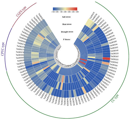 Based on the published wheat transcriptome data, the response characteristics of TaGRX genes to abiotic stresses such as drought, high temperatures, low P, and salt were analyzed. The results reveal that the expression levels of some TaGRX genes varied significantly under different stress conditions, and significant differences were observed in the expression characteristics of different subfamilies (Figure 10). Almost all genes from CPYC and CGFS subfamilies mainly responded to high-temperature stress. For example, TaGRX11, TaGRX37, and TaGRX82 were significantly upregulated under high-temperature stress. The CC subfamily genes mainly responded to drought, salt, and low-P stresses. For example, TaGRX53 and TaGRX66 were significantly upregulated in response to salt stress, and TaGRX19 and TaGRX33 were significantly upregulated under low-P stress. Additionally, some CC subfamily genes (such as TaGRX39 and TaGRX50) could respond to both drought and salt stresses, and some (such as TaGRX5 and TaGRX60) could respond to both high-temperature and drought stresses. These results suggested that some TaGRX genes played a certain role in coping with abiotic stress.