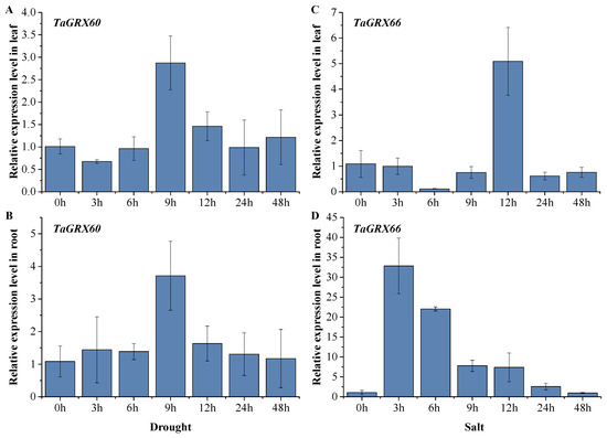Expression patterns of TaGRX60 and TaGRX66 genes under drought and salt stresses. Relative expression of TaGRX60 under drought (A,B) stress and of TaGRX66 under salt (C,D) stress. The x-axis indicates treatment duration, and the y-axis indicates relative expression level. Expression data are expressed as the means of three biological replicates.