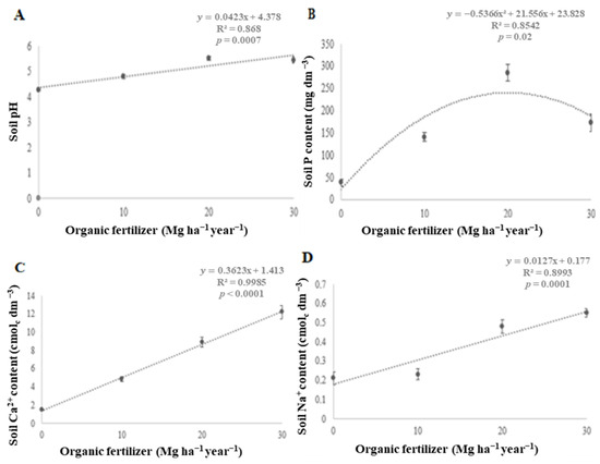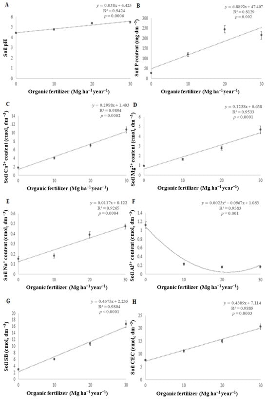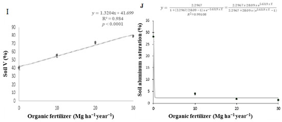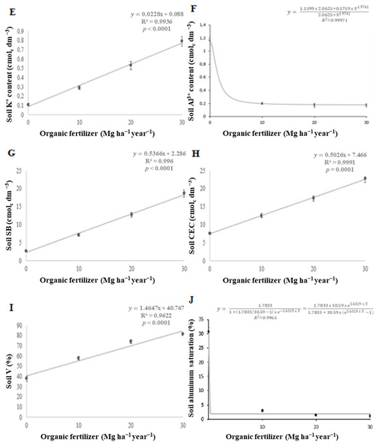 (A) Linear effect (p = 0.0006) of organic fertilizer (p = 0.004; SE = 0.17) on soil pH; (B) Linear effect (p = 0.002) of organic fertilizer (p = 0.01; SE = 37.7) on soil P content (mg dm−3); (C) Linear effect (p = 0.0002) of organic fertilizer (p = 0.001; SE = 1.09) on soil Ca2+ content (cmolc dm−3); (D) Linear effect (p < 0.0001) of organic fertilizer (p = 0.0004; SE = 0.44) on soil Mg2+ content (cmolc dm−3); (E) Linear effect (p = 0.0004) of organic fertilizer (p = 0.0025; SE = 0.05) on soil Na+ content (cmolc dm−3); (F) Quadratic effect (p = 0.001) of organic fertilizer (p = 0.0001; SE = 0.09) on soil Al3+ content (cmolc dm−3); (G) Linear effect (p < 0.0001) of organic fertilizer (p = 0.0007; SE = 1.56) on soil SB (cmolc dm−3); (H) Linear effect (p = 0.0003) of organic fertilizer (p = 0.002; SE = 1.67) on soil CEC (cmolc dm−3); (I) Linear effect (p < 0.0001) of organic fertilizer (p < 0.0001; SE = 4.08) on soil V (%); (J) Logistical effect of organic fertilizer (p < 0.0001; SE = 1.37) on soil aluminum saturation (%) cultivated with forage cactus Opuntia stricta (Haw.) Haw. at 10 to 20 cm depth in Arcoverde, Pernambuco, Brazil. Bars refer to the sample standard error [21].