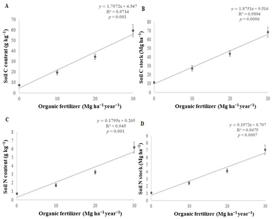 There was a positive linear effect (p < 0.05) of organic fertilizer at 0 to 10 (Figure 4) and 10 to 20 cm depths (Figure 5) on soil C and N contents and stocks.