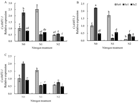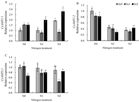 Effects of combined application of N and Se on the expression of CsATMs for N metabolism in roots. (A) The relative expression of CsAMT1.1; (B) the relative expression of CsAMT1.2; (C) the relative expression of CsAMT3.1. Different letters indicate treatments that are significantly different at p < 0.05.