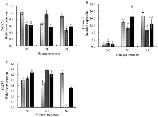 Effects of combined application of N and Se on the expression of CsGSs and CsTS1 for N metabolism in mature leaves. (A) The relative expression of CsGS1.1; (B) the relative expression of CsGS1.2; (C) the relative expression of CsTS1. Different letters indicate treatments that are significantly different at p < 0.05.