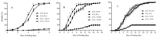The mortality of C. suppressalis larvae fed on Bt rice grown under eCO2 was significantly higher than that under aCO2 during seedling stage for 4 and 5 days respectively (p < 0.05; Figure 2A). After fed on Bt rice grown under eCO2 for 4, 5, 6, 8, 9 and 10 days during tillering stage, the larval mortality of C. suppressalis was significantly lower than that under aCO2 respectively (p < 0.05; Figure 2B). After fed on Bt rice grown under aCO2 for 28 days during heading stage, the mortality of C. suppressalis larvae reached 100%, and the larval mortality of C. suppressalis reached 100% after fed on Bt rice grown under eCO2 for 33 days (Figure 2C).