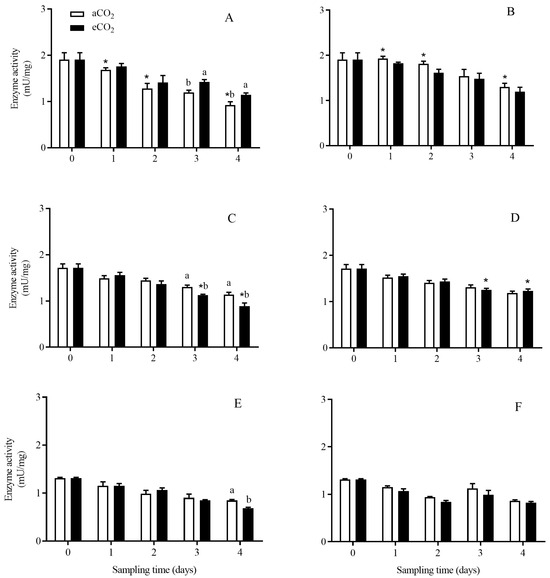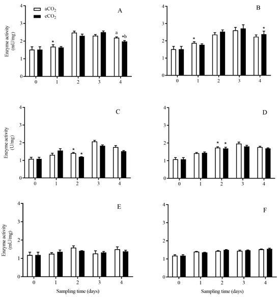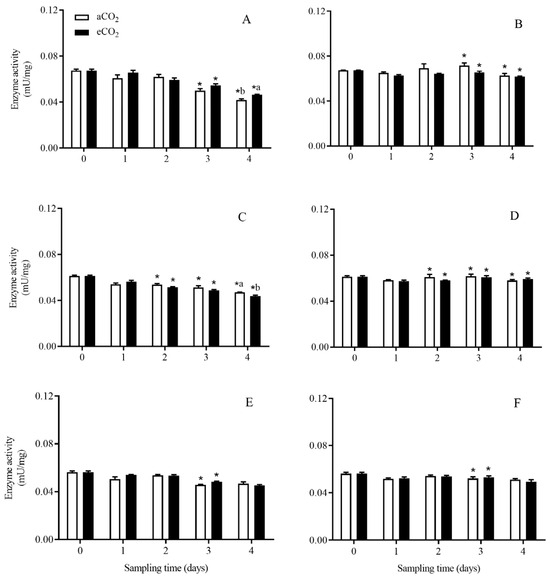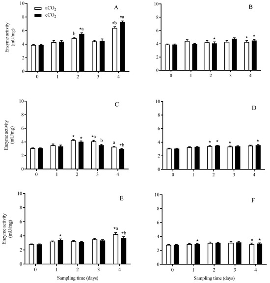The activity of aminopeptidase enzyme in C. suppressalis larvae fed on Bt and non-Bt rice plants grown under aCO2 and eCO2 for 0, 1, 2, 3 and 4 days, during seedling, tillering and heading stages. Note: (A,B)—seedling stage; (C,D)—tillering stage; (E,F)—heading stage; (A,C,E)—Bt rice, (B,D,F)—non-Bt rice. Each value represents means ± SE. *, different lowercase letters indicate significant difference between Bt and non-Bt rice grown under same CO2 level and at same rice growth stage, and between aCO2 and eCO2 for same rice cultivar and at same rice growth stage by the Student’s t-test at p < 0.05.