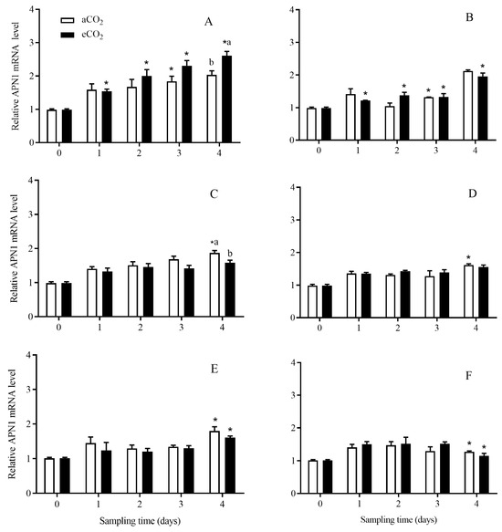The APN1 expression level in C. suppressalis larvae fed on Bt and non-Bt rice plants grown under aCO2 and eCO2 for 0, 1, 2, 3 and 4 days, during seedling, tillering and heading stages. Note: (A,B)—seedling stage; (C,D)—tillering stage; (E,F)—heading stage; (A,C,E)—Bt rice, (B,D,F)—non-Bt rice. Each value represents means ± SE. *, different lowercase letters indicate significant difference between Bt and non-Bt rice grown under same CO2 level and at same rice growth stage, and between aCO2 and eCO2 for same rice cultivar and at same rice growth stage by the Student’s t-test at p < 0.05.
