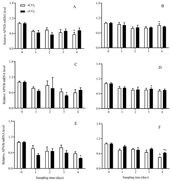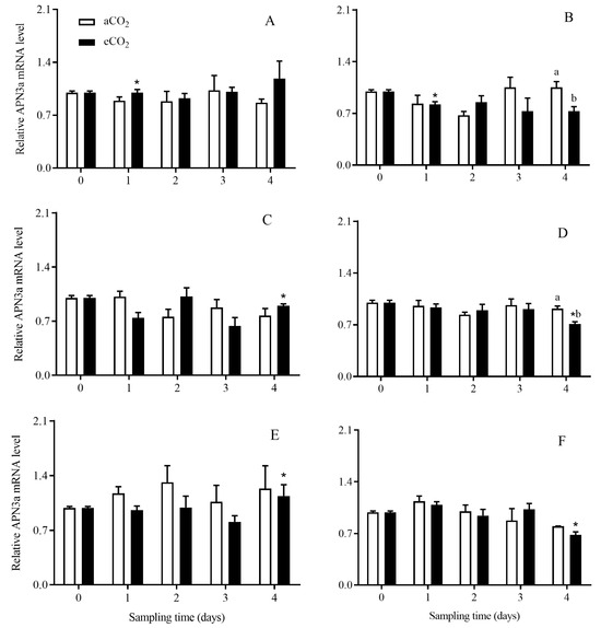 The APN3b expression level in C. suppressalis larvae fed on Bt and non-Bt rice plants grown under aCO2 and eCO2 for 0, 1, 2, 3 and 4 days, during seedling, tillering and heading stages. Note: (A,B)—seedling stage; (C,D)—tillering stage; (E,F)—heading stage; (A,C,E)—Bt rice, (B,D,F)—non-Bt rice. Each value represents means ± SE. *, different lowercase letters indicate significant difference between Bt and non-Bt rice grown under same CO2 level and at same rice growth stage, and between aCO2 and eCO2 for same rice cultivar and at same rice growth stage by the Student’s t-test at p < 0.05.