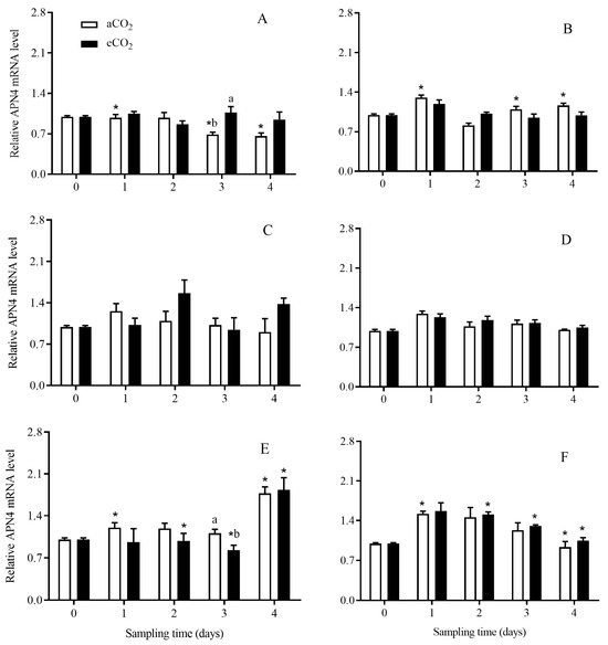 The APN4 expression level in C. suppressalis larvae fed on Bt and non-Bt rice plants grown under aCO2 and eCO2 for 0, 1, 2, 3 and 4 days, during seedling, tillering and heading stages. Note: (A,B)—seedling stage; (C,D)—tillering stage; (E,F)—heading stage; (A,C,E)—Bt rice, (B,D,F)—non-Bt rice. Each value represents means ± SE. *, different lowercase letters indicate significant difference between Bt and non-Bt rice grown under same CO2 level and at same rice growth stage, and between aCO2 and eCO2 for same rice cultivar and at same rice growth stage by the Student’s t-test at p < 0.05.