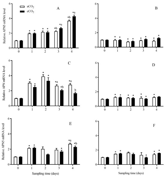 The APN5 expression level in C. suppressalis larvae fed on Bt and non-Bt rice plants grown under aCO2 and eCO2 for 0, 1, 2, 3 and 4 days, during seedling, tillering and heading stages. Note: (A,B)—seedling stage; (C,D)—tillering stage; (E,F)—heading stage; (A,C,E)—Bt rice, (B,D,F)—non-Bt rice. Each value represents means ± SE. *, different lowercase letters indicate significant difference between Bt and non-Bt rice grown under same CO2 level and at same rice growth stage, and between aCO2 and eCO2 for same rice cultivar and at same rice growth stage by the Student’s t-test at p < 0.05.