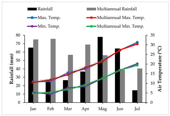This trial was conducted in 2023 at Tenuta Montefoscoli owned by Castellani, Palaia (Pisa, Italy) (43°33′54′′ N, 10°44′23′′ E). The vineyard (Vitis vinifera L., cv: Vermentino), was established in 2019, and trained to Guyot (unilateral). The vines are spaced 2.30 m between rows, and 0.8 m within rows, with canes tied to a supporting wire at about 1 m above the ground. The soil texture is of medium mixture tending to sandy. The vineyard was managed in accordance with organic farming criteria (Reg. CE 834/2007). The area exhibited a characteristic Mediterranean climate, featuring seasonal rainfall spikes in spring and fall. Figure 1 illustrates the monthly cumulative precipitation (in millimeters) as well as the average minimum and maximum air temperatures at the experimental site for the period when the trial took place, alongside the 10-year average values.