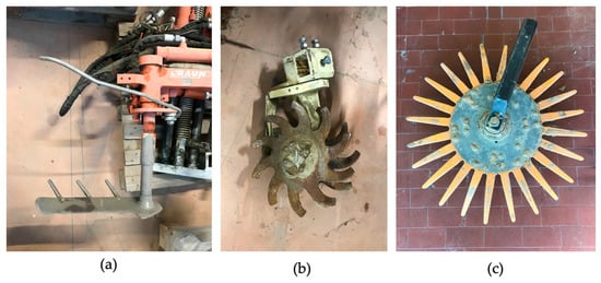 Rollhacke (Braun, Landau in der Pfalz, Germany) consists of a rotary star tiller with two disks (Figure 2b). The implement loosens the soil, removing weeds near the area under the row, and throws a quantity of soil under the row, suffocating weeds present in this area. Rollhacke works by dragging, and, therefore, without the aid of the hydraulic system. During the trial, rollhacke was mounted on a tool-holder positioned in the front area of the tractor. The tool-holder consists of UKR-basic frame with single tube (Braun, Landau in der Pfalz, Germany), hydraulic width adjustment, pair of sliding parts with side inclination adjustment, and rigid support wheels. The tool-holder has a minimum width of 1.30 m, depth of 0.70 m, and height of 0.75 m. During the test, the width of the tool-holder was set to 1.60 m. The level of rollhacke tillage intensity can be controlled by adjusting the angle of the disk system on the bracket.