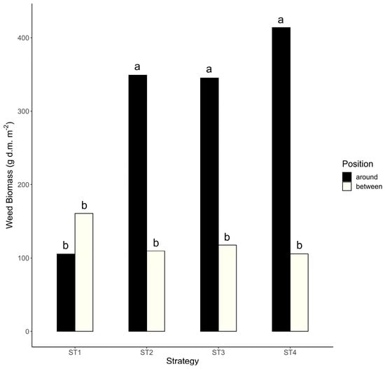 Effect of the interaction among strategy and position on weed biomass four days after the last under-row weed control intervention. Means denoted by different letters are significantly different at p < 0.05 (LSD test). ST1—Strategy 1, in which both the first and the second intervention of under-row weed control were performed with the tool-holder equipped with rollhacke and finger weeder; ST2—Strategy 2, in which the first intervention was carried out with rollhacke, and the second one with blade weeder; ST3—Strategy 3, in which the first intervention was realized with tool-holder equipped with rollhacke and finger weeder, and the second one with blade weeder; ST4—Strategy 4, in which rollhacke was used during the first treatment, and the tool-holder equipped with rollhacke and finger weeder was used during the second one. Around—around vine trunks; Between—between vine trunks.
