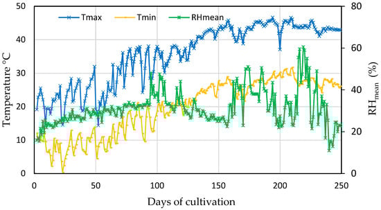 Minimum (Tmin) and maximum (Tmax) daily air temperatures, and mean daily relative humidity (RHmean) for average data of two consecutive seasons of tomato growth.