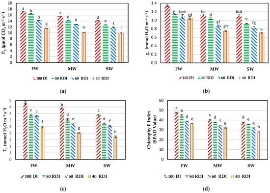 Interaction effects between water quality and irrigation water levels on (a) photosynthesis (Pn), (b) stomatal conductance (gs), (c) transpiration (Tr), (d) chlorophyll index (SPAD Value), for FW (Fresh-Water); MW (Mixed-Water); SW (Salinity-Water); 100% Full irrigation; and 80%, 60%, and 40% potential ETc. The data are the mean value ± standard error and based on the LSD test at the 5% level (p < 0.05), distinct letters represent significant differences within treatments.