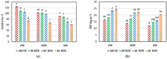 Interaction effects between water quality and irrigation water levels on (a) total fruit yield (t ha−1) and (b) water productivity (WP), for FW (Fresh-Water); MW (Mixed-Water); SW (Salinity-Water); 100% Full irrigation; and 80%, 60%, and 40% potential ETc. The data are the mean value ± standard error and the LSD test was conducted at the 5% level (p < 0.05), and distinct letters in the figure indicate significant differences between treatments.